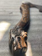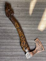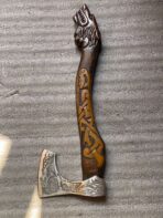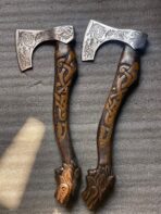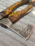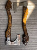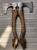 This stunning set of two handmade Viking axes is a must-have for any collector of Norse and Viking art. Each axe features a detailed wolf head carving at the base of the handle and an intricately carved Celtic knot design along the handle’s length. The high-carbon steel heads are etched with matching Viking motifs, making them a true showpiece. These axes are ideal for display, reenactments, or as an unforgettable gift. Order your custom axe set today and own a piece of history.