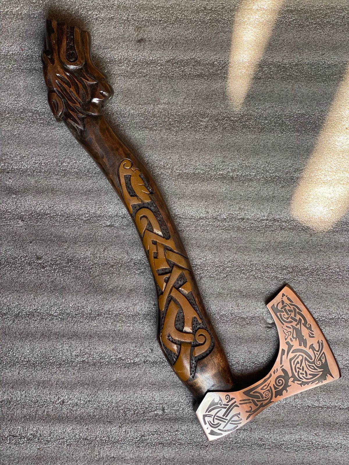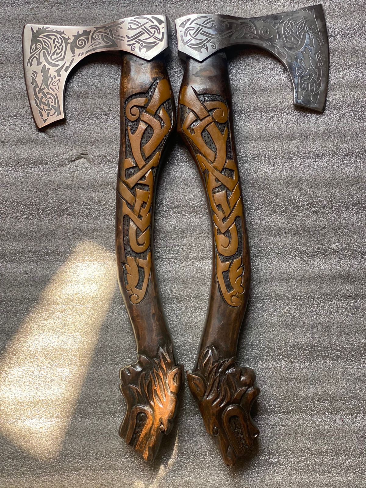 This stunning set of two handmade Viking axes is a must-have for any collector of Norse and Viking art. Each axe features a detailed wolf head carving at the base of the handle and an intricately carved Celtic knot design along the handle’s length. The high-carbon steel heads are etched with matching Viking motifs, making them a true showpiece. These axes are ideal for display, reenactments, or as an unforgettable gift. Order your custom axe set today and own a piece of history.