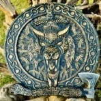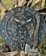Medieval Fenrir Shield & Axe Set, Viking Round Shield, Viking Wolf Shield/Axe, Wood Carved Shield, Viking Wall Decor and Birthday Gift